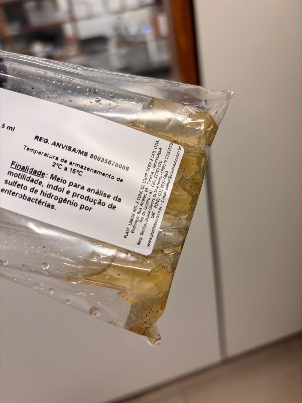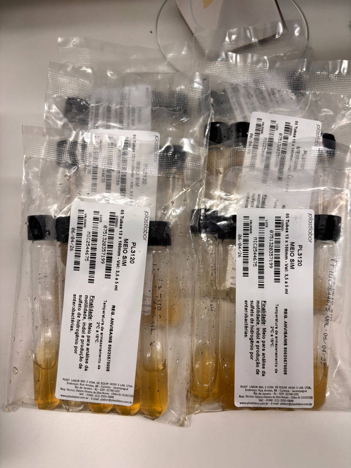 | Obs.: | Recebemos a remessa de emergência da plastlabor, mas os pacotes de meio SIM chegaram totalmente inadequados para uso. Os pacotes estava acondicionados na horizontal e os meios estavam aparentando estarem "derretidos" quando foram retirados da caixa, conforme as fotos em anexo |