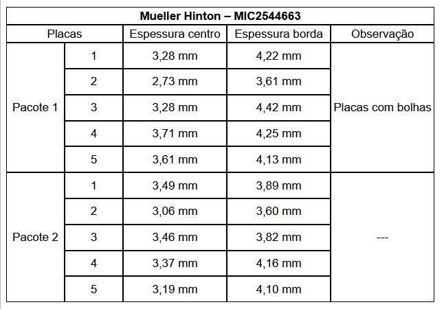 | Obs.: | O ultima entrega de Agar MH de 140 mm está REPROVADA pela espessura, seguem os resultados que verificamos: |