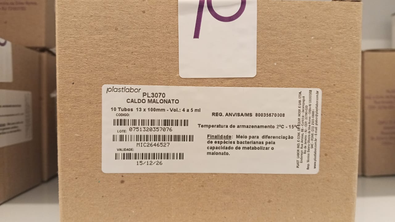 | Obs.: | O volume continha 2 tipos de caldo, o malonato e tioglicolato. No momento do recebimento do material foi identificado que a temperatura estava fora do recomendado pelo fabricante do produto. Foi recebido em uma temperatura de 24ºC, o produto recomenda de 2 a 15ºc. Diante da situação foi aberta uma NC. |